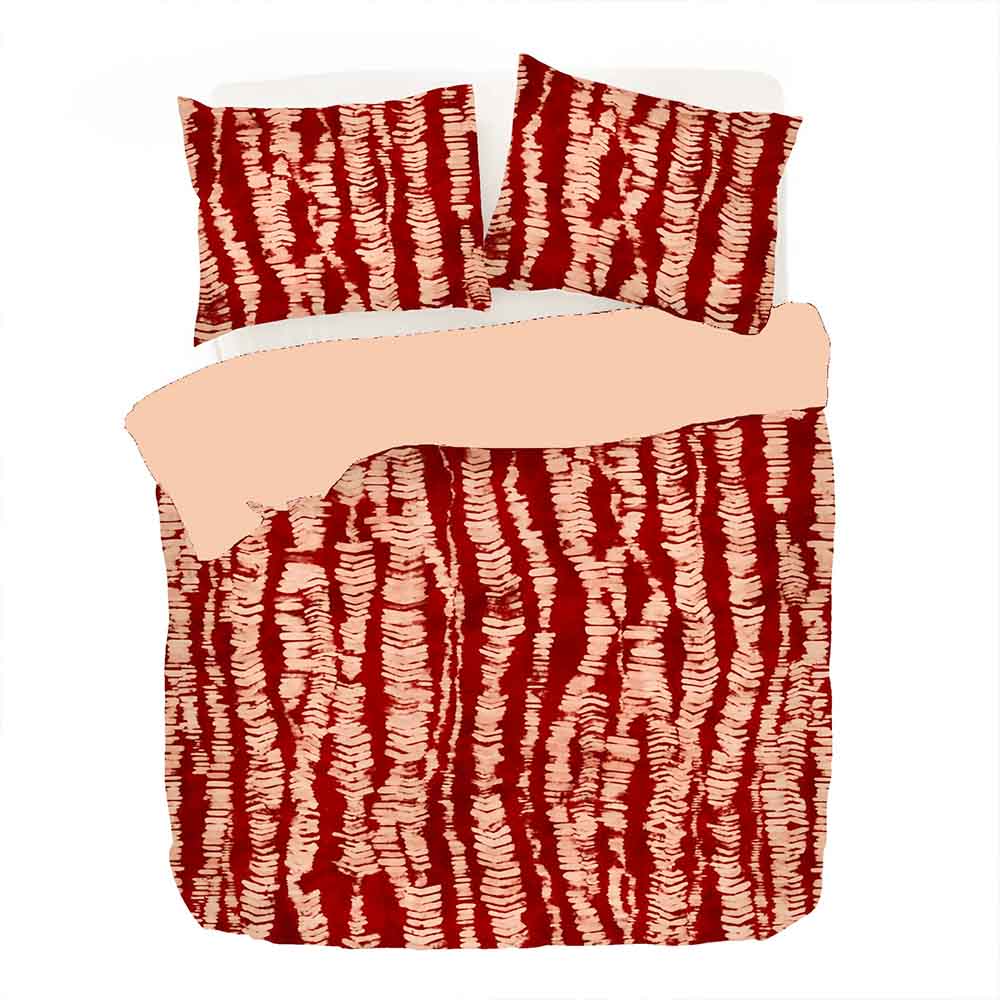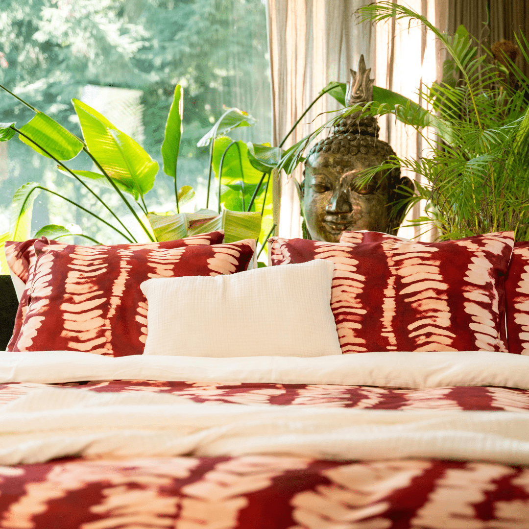 Chikuma doet denken aan de verftechniek tie-dye maar dan in een geheel nieuwe uitvoering. De crème kleurige organische vormen liggen in rechte lijnen op de granaatappel rode ondergrond. De combinatie van zachte, ronde vormen in rechte banen zorgt voor een geordend maar toch speels dessin. De achterzijde van dit dekbedovertrek is crèmekleurig. Dekbedovertrek Chikuma is gemaakt van 100% schone biologische katoen satijn: super zacht, luxe glans én comfortabel door het ademende karakter van katoen. De achterzijde van het overtrek is effen donkerrood.