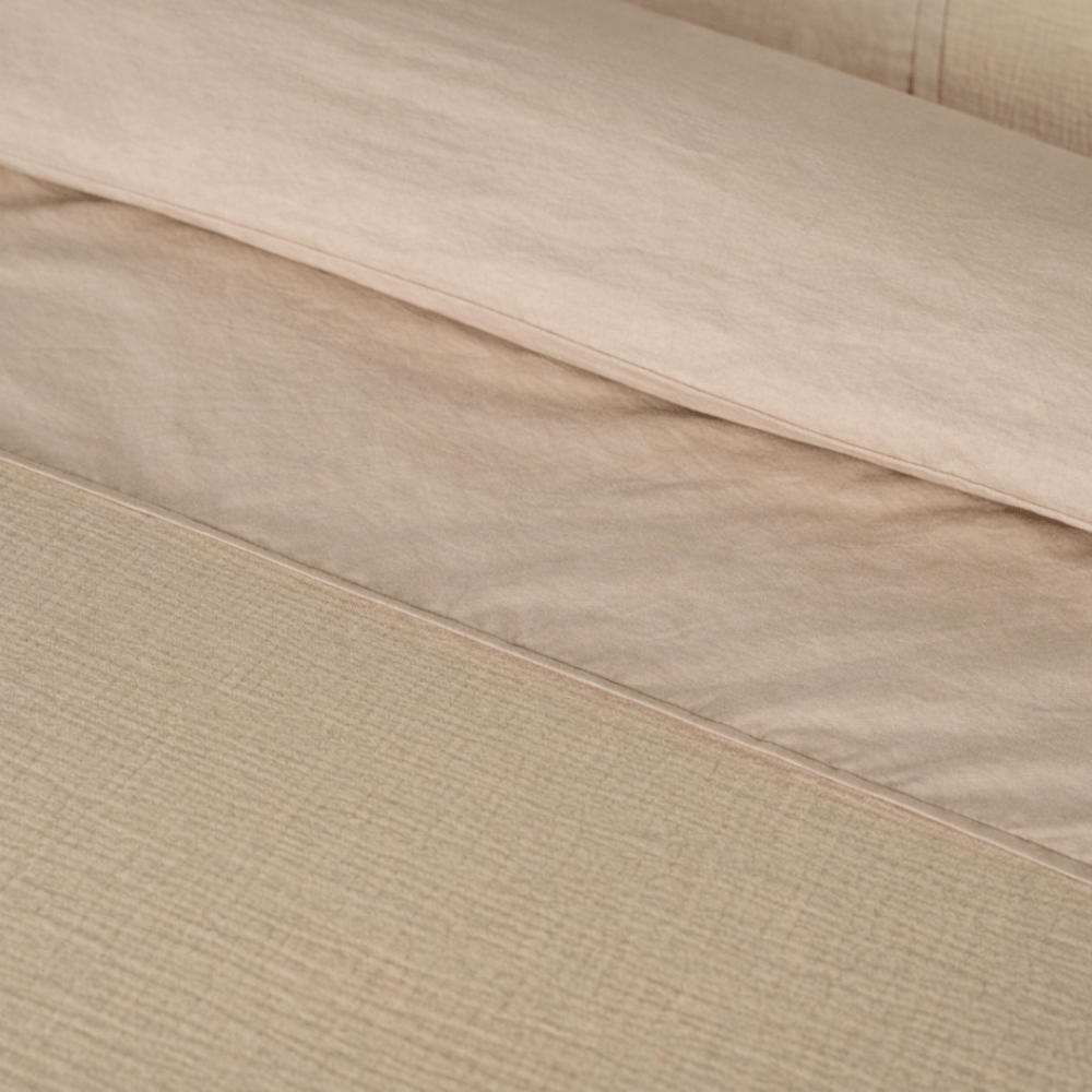 80% van het overtrek bestaat uit een zachte, soepel vallende mousseline stof. Deze fijn geweven structuur voelt licht en comfortabel. De boven- en achterkant zijn uitgevoerd in perkal: een frisse, ademende katoenkwaliteit die sterk is en prettig aanvoelt op de huid.