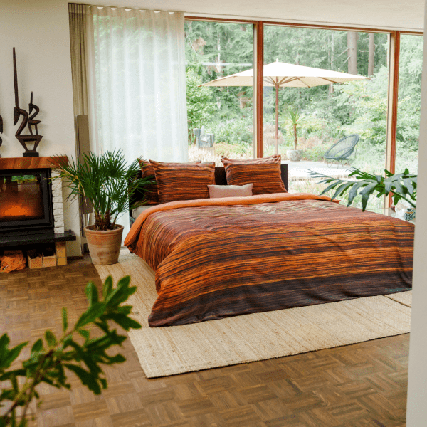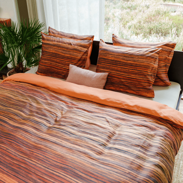 Dekbedovertrek Mosa van de Maasai lijn is geïnspireerd op het nomaden bestaan en de uitgestrekte Afrikaanse vlaktes. Het gestreepte dessin bevat mooie aardse rode en oranje tinten. Doordat de verschillende kleuren mooi in elkaar overlopen doet het bijna denken aan een zonsondergang.