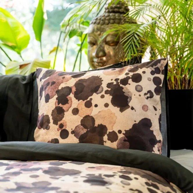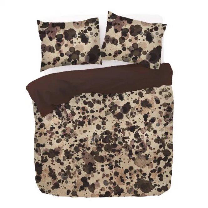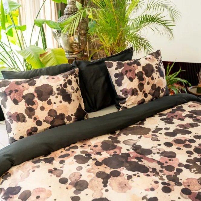 Nihon is een artistiek, spetterend dessin. Op een beige ondergrond zijn willekeurige verfspetters aangebracht in bruin en rood tinten. Een echt kunstwerkje! De achterzijde van dit dekbedovertrek is effen donkerbruin. Dekbedovertrek Nihon is gemaakt van 100% schone biologische katoen satijn: super zacht, luxe glans én comfortabel door het ademende karakter van katoen.