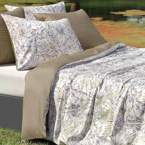 Het Dommelin dekbedovertrek Ardesch Brons is uitgevoerd in een fijne kwaliteit satijn van 400 threadcount. Een weelderig tafereel van grote bladeren siert de bovenkant, de