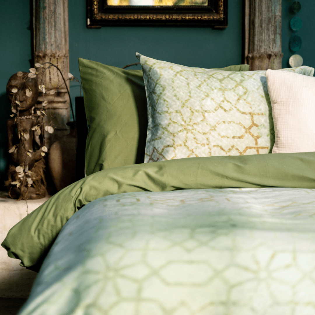 Dessin Zuru heeft een zacht groen/gele ondergrond in mooie kleurvervagingen. Hier overheen ligt een subtiel grafisch dessin, door de vervagingen lijkt je te kijken naar een eeuwenoude mozaïekvloer. Een rustgevend geheel geschikt voor elk interieur. Dit dekbedovertrek is gemaakt van 100% Egyptische katoen satijn. Hierdoor is het overtrek niet alleen oersterk maar ook heel glad en zacht. Door de gladde vezel in combinatie met de satijnbinding is dit dekbedovertrek zacht voor huid en haar. De achterzijde van het dekbedovertrek is effen groen.