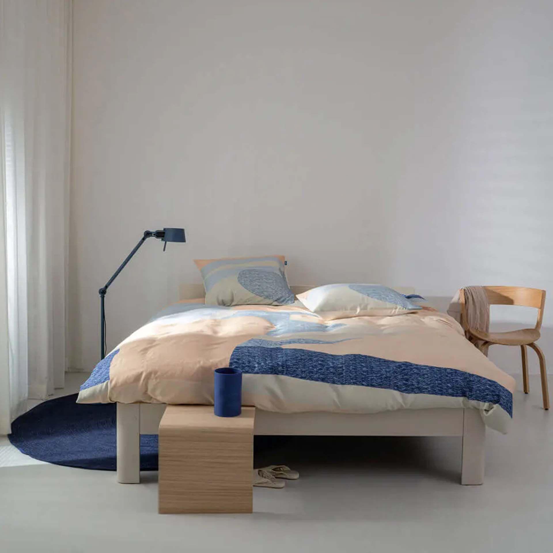 Ronde en glooiende figuren in zachte terra tinten, opgebouwd uit fijne structuren vormen de basis van het Cloud Nine overtrek. De kleur blauw zorgt voor een verrassende dosis frisheid. De achterkant van het overtrek heeft een neutrale zand kleur. Dit overtrek wordt gemaakt van 100% biologisch katoensatijn en voelt heerlijk soepel en glad aan. Alle Auping dekbedovertrekken hebben over de gehele breedte en aan beide kanten een extra lange instopstrook. Hierdoor kun je het dekbedovertrek gemakkelijk onder je matras instoppen. Koude voeten zijn dus verleden tijd. Je herkent de extra lange instopstrook aan de lengtemaat: 200/220 Kussensloop met dubbele hotelsluiting De Cloud nine kussenslopen hebben een zogenaamde dubbele hotelsluiting. Een hotelsluiting is een gevouwen opening aan de kortste kant van de kussensloop. Met een dubbele hotelsluiting maakt het niet uit welke kant van je kussen je gebruikt, het ziet er altijd netjes uit. Button down De Auping dekbedovertrekken en dekbedden zijn voorzien van het button down systeem. Dit zijn handige knopen en lussen waarmee je het dekbed en overtrek aan elkaar vast maakt, zodat het niet meer verschuift. Auping dekbedovertrekken hebben lusjes aan de binnenkant van het overtrek. Onze dekbedden hebben op dezelfde plekken knopen. De lusjes uit het overtrek kunnen om deze knopen gedaan worden zodat het dekbed niet kan verschuiven in het overtrek. En met deze knopen en lussen is het óók nog eens makkelijker om je bed netjes op te maken. Duurzaam slapen Bij Auping dromen we van een uitgeruste wereld. Van slapen onder heerlijk beddengoed dat op een milieuvriendelijke manier en onder goede arbeidsomstandigheden is gemaakt. Daarom hebben al onze dekbedovertrekken het internationaal erkende GOTS certificaat. Dit is de allerhoogste internationale norm voor biologisch textiel. Het is niet alleen een garantie voor topkwaliteit maar geeft ons ook de zekerheid dat de hele keten voldoet aan strenge sociale- en milieueisen.
