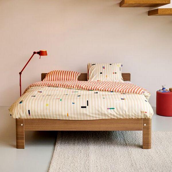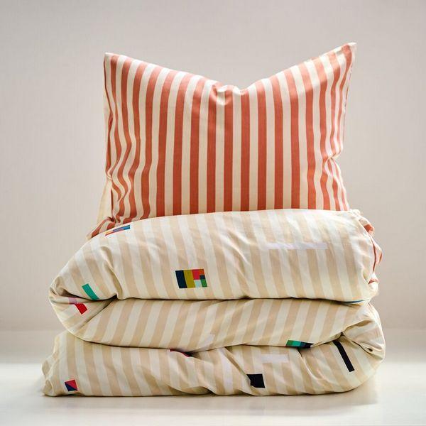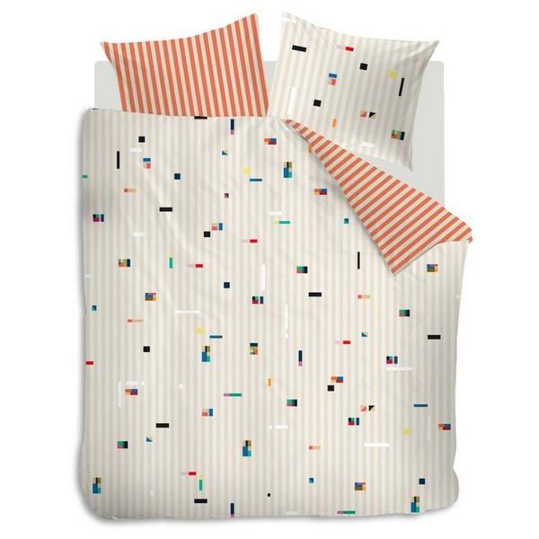 Colourful dreams is een grafisch overtrek met witte lijnen op een beige achtergrond, en krijgt zijn vrolijke uitstraling door de kleurrijke blokken die speels op het overtrek geplaatst zijn. De achterkant van het overtrek en de achterkant van de slopen zijn gestreept in warm beige en donkeroranje, gemaakt van 100% duurzaam katoensatijn.