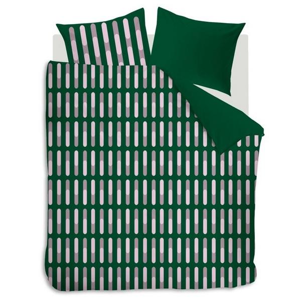 Het  patroon op de voorkant is roze in combinatie met mauve, wat een warme uitstraling geeft aan je slaapkamer. De achterzijde van het overtrek en de kussenslopen zijn effen groen.