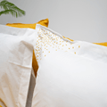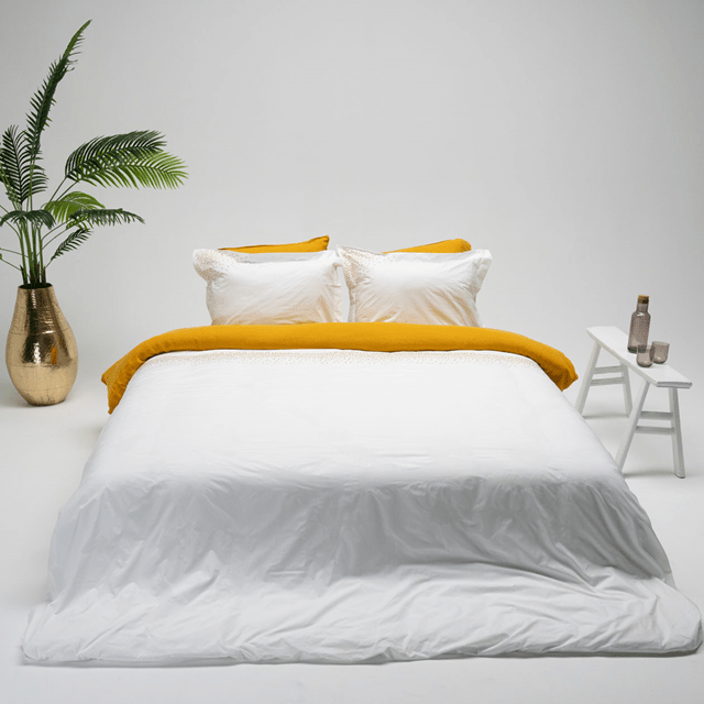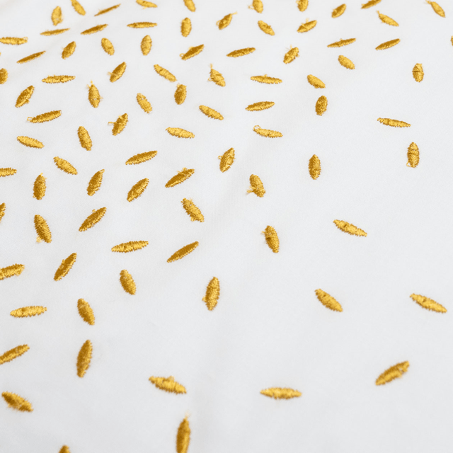 Dit Dommelin dekbedovertrek is uitgevoerd in een fijne kwaliteit percal katoen in de kleur wit en voorzien van een prachtige geborduurde strook van kleine goudkleurige korreltjes. Geleverd inclusief kussenslopen.