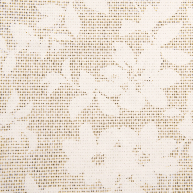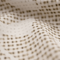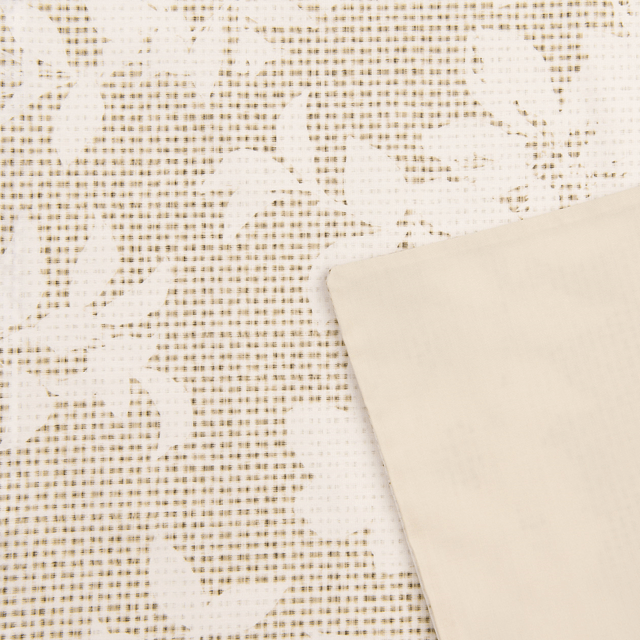 Het lichte silhouette van bladeren schijnt door een fijne illustratie van bruine blokjes. Het doek heeft de kleur ecru, de onderzijde is beige. Het dekbedovertrek