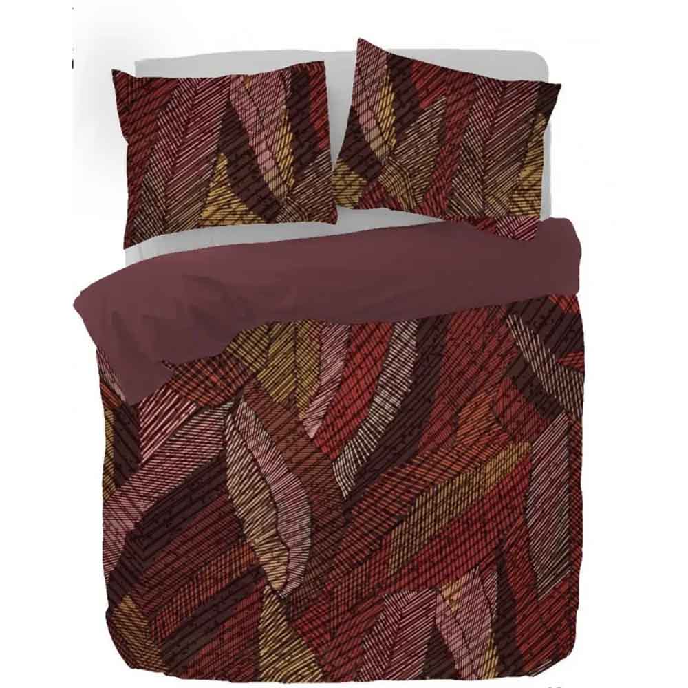 Dekbedovertrek Kymani heeft een drukker patroon met strepen in voornamelijk rode, paarse en gele tinten. De uni kleur op de achterkant is donkerrood.