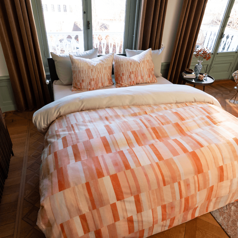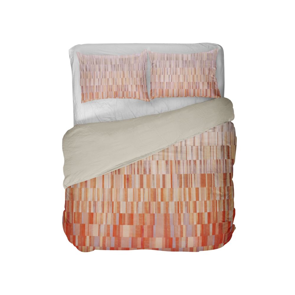 Het vrolijke dessin van het Kayori Seki dekbedovertrek bestaat uit diverse tinten oranje, roze en wit en brengt daarmee een vleugje ectra kleur in jouw slaapkamer .  Het dessin is opgedeeld in horizontale lijnen die allerlei vakjes bevatten. Door de verschillende kleuren ontstaat er een mooi verloop. Sla het overtrek een stukje om en je ziet een effen achterzijde.