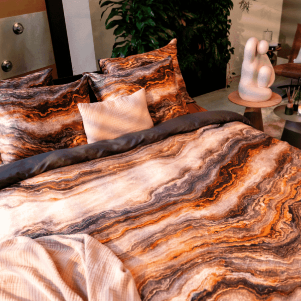 Dekbedovertrek Tokyu is geïnspireerd op het krachtige kleurenspel dat ontstaat bij edelstenen. Verscheidene kleuren bruin/oranje wisselen elkaar af met tussendoor een zacht zalmroze toon. De kleur in combinatie met de print zorgt voor een uniek dessin waardoor het overtrek direct de aandacht vraagt. De achterzijde van het dekbedovertrek is effen bruin. Dekbedovertrek Tokyu is gemaakt van 100% schone biologische katoen satijn: super zacht, luxe glans én comfortabel door het ademende karakter van katoen.