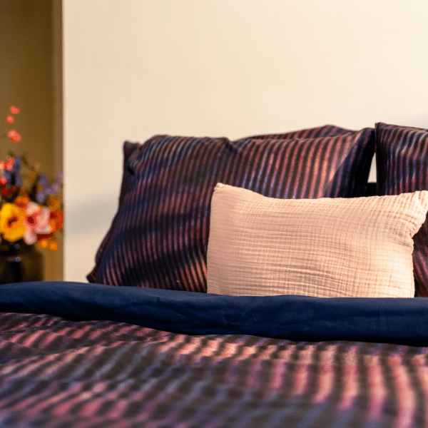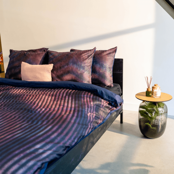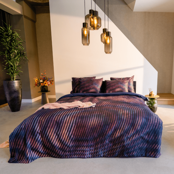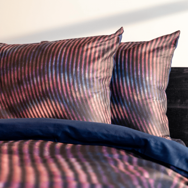 Dekbedovertrek Utano is een bijzonder dessin met een futuristisch tintje. Dit overtrek combineert twee lijnenspellen met elkaar waardoor een dessin ontstaat dat in beweging lijkt te zijn. De mooie diepe kleuren rood, blauw en paars maken het geheel helemaal af. De achtergrond van het dessin is effen donkerblauw. Dekbedovertrek Utano is gemaakt van 100% schone biologische katoen satijn: super zacht, luxe glans én comfortabel door het ademende karakter van katoen. De achterzijde van het overtrek is effen donkerrood.