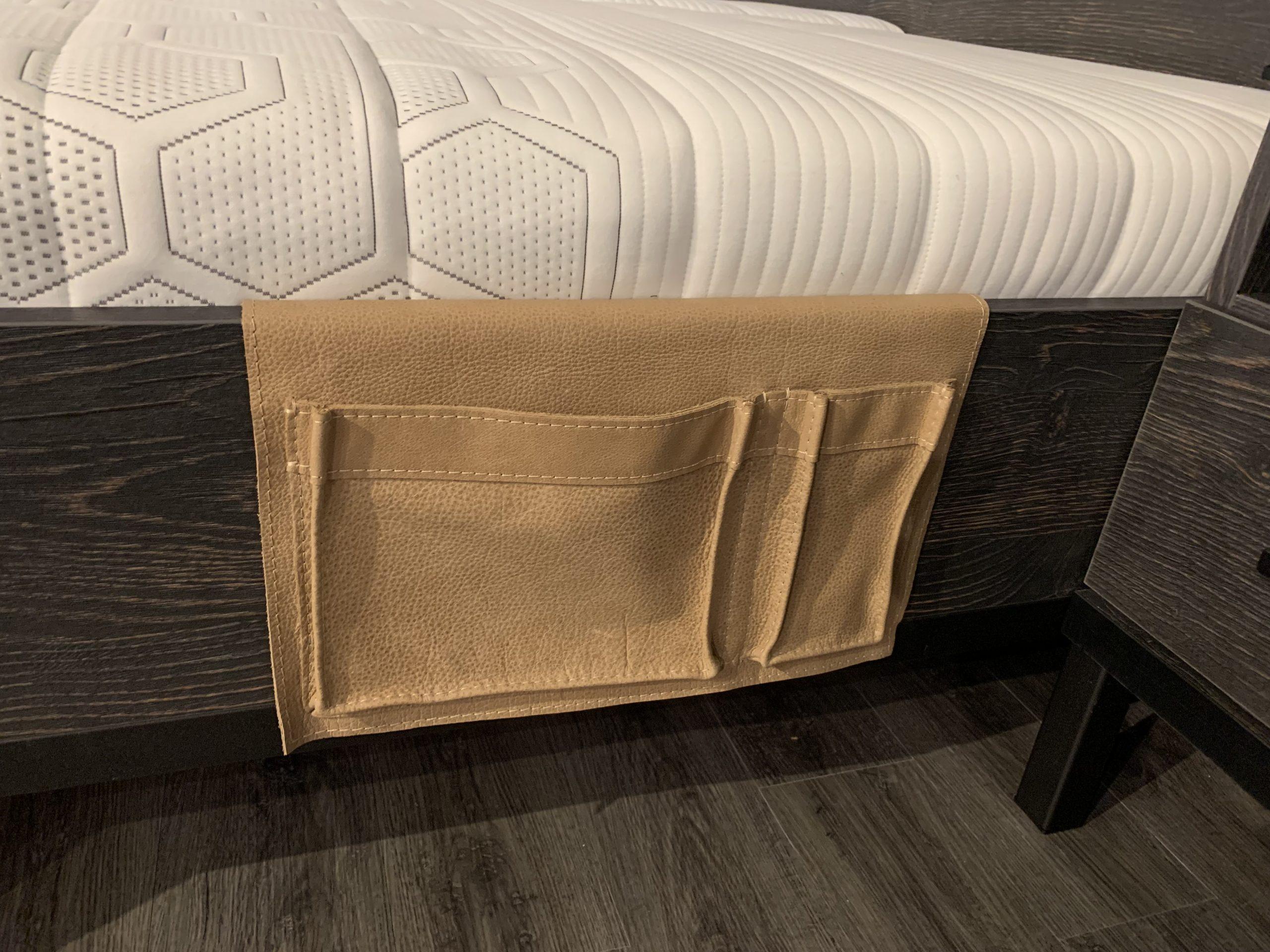 Leuk bed accesoire , opbergzak van heerlijk soepel leer wat u aan iedere zijde van uw ledikant kunt hangen.