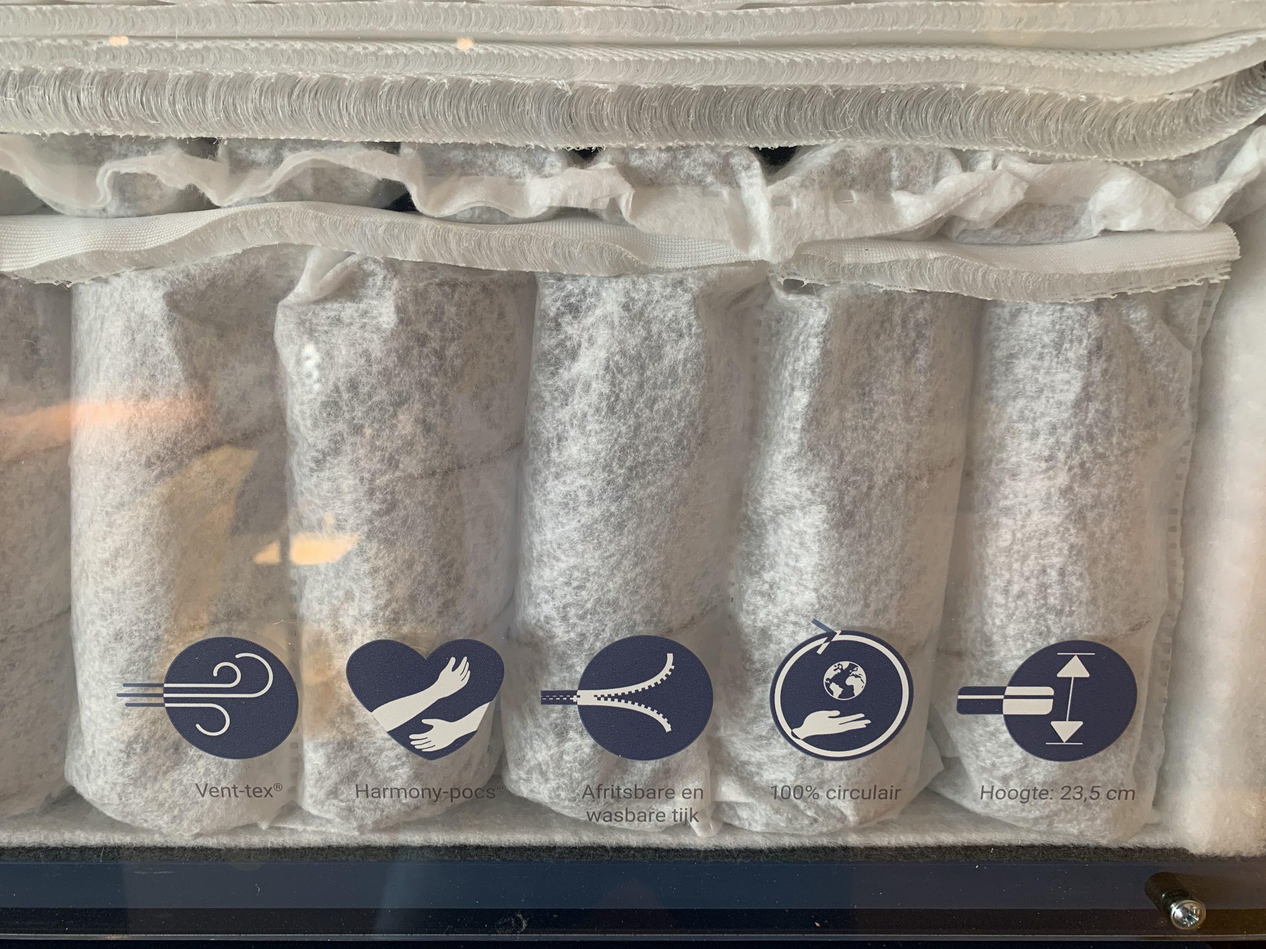 Dit matras heeft namelijk een Harmony-pocs® comfortlaag, een laag die we speciaal hebben ontwikkeld voor Auping Elysium. Deze laag is opgebouwd uit heel veel (meer dan 800) miniveertjes die individueel verpakt zijn in kleine textielzakjes. De veertjes zorgen voor een goede drukverdeling en geven je het gevoel te worden omarmd, alsof je een liefdevolle knuffel krijgt. Gelukkig wel zonder dat het benauwd aanvoelt, want de miniveertjes hebben een open structuur, die zorgt voor een goede luchtdoorstroming en vochtregulatie.