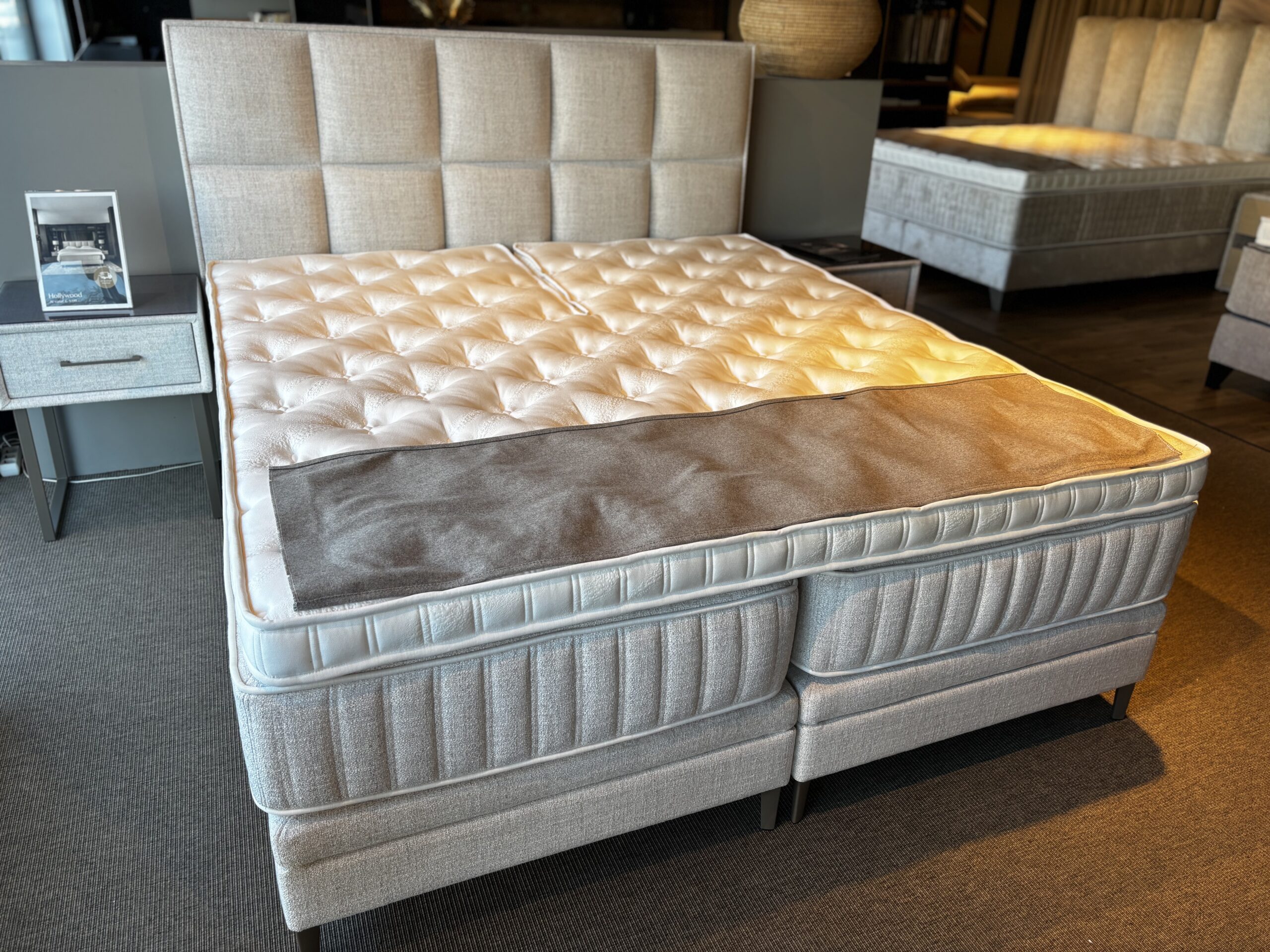Moderne luxe in een krachtig design Met zijn strakke, gedefinieerde belijning in het hoofdbord straalt de Serta Hollywood pure klasse uit. De diepe, verticale stiknaden geven een indrukwekkend gevoel van hoogte en elegantie, terwijl de robuuste vormgeving zorgt voor een krachtig statement in elke slaapkamer. Dit model is ontworpen voor wie op zoek is naar een moderne uitstraling met een luxueuze hotelsfeer.
