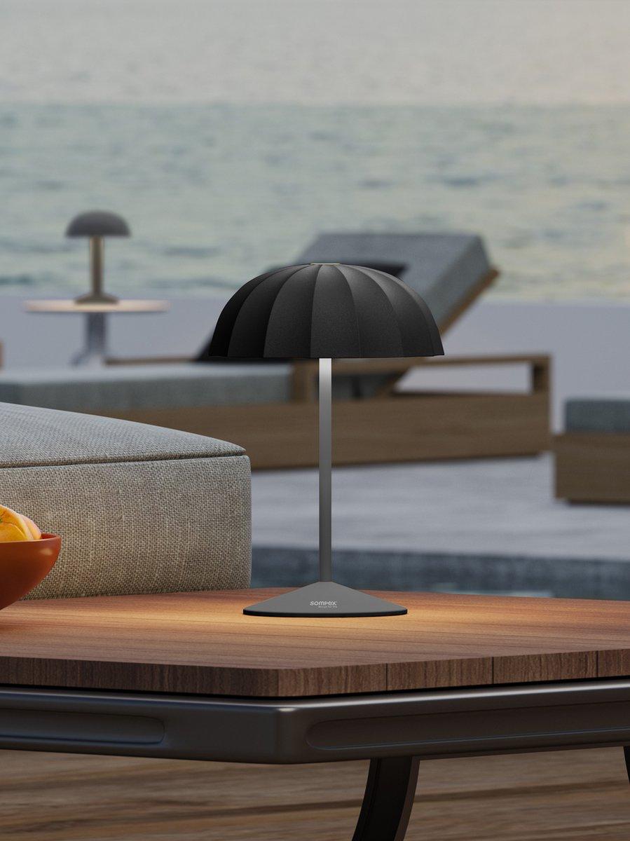 Aluminium, batterijgevoed, dimbaar, 2 lichtkleuren, 2.5W, laadstation Met de OMBRELLINO batterijlamp hoef je niet te reizen om dat vakantiegevoel te krijgen. De lamp met extra