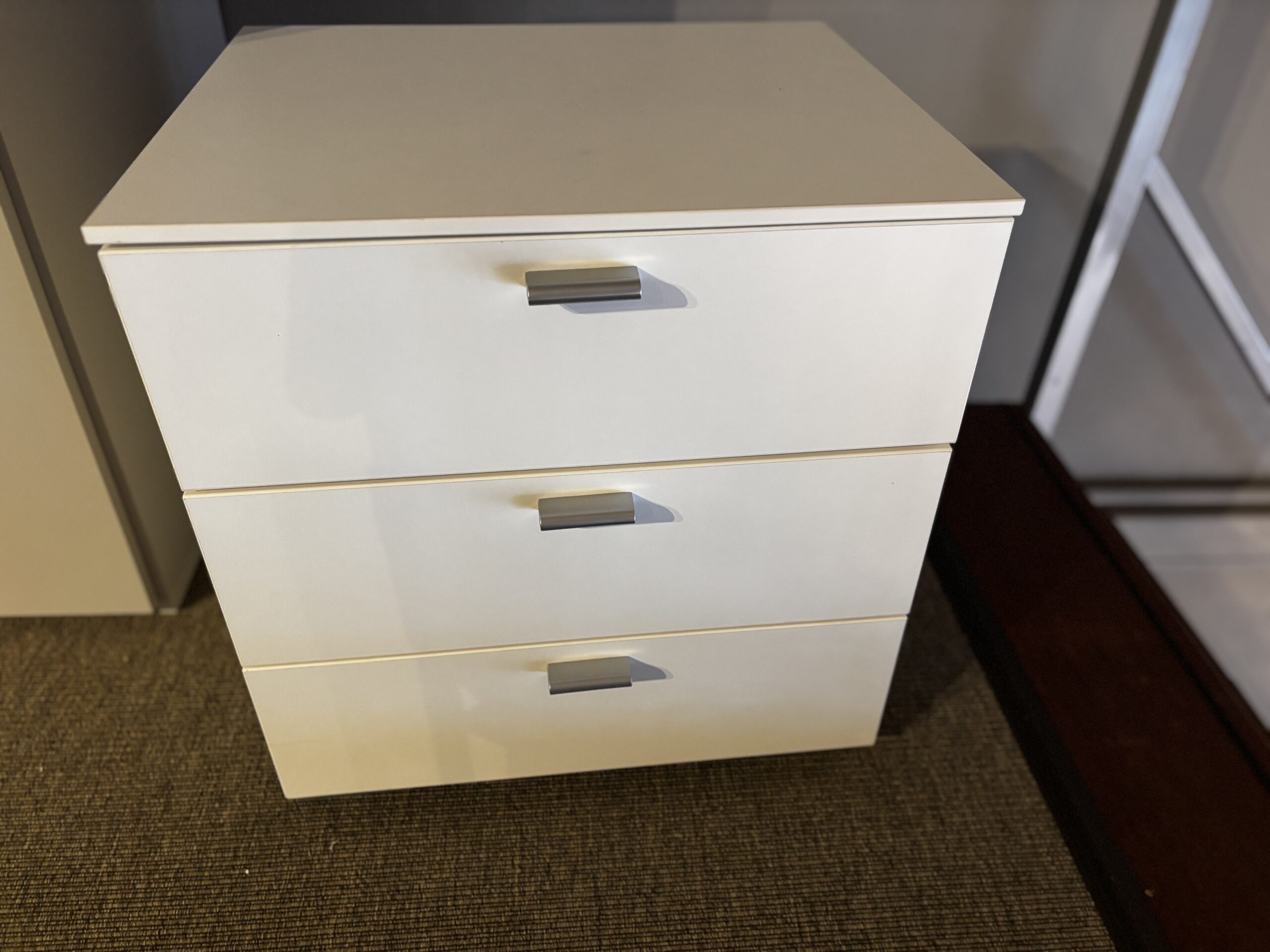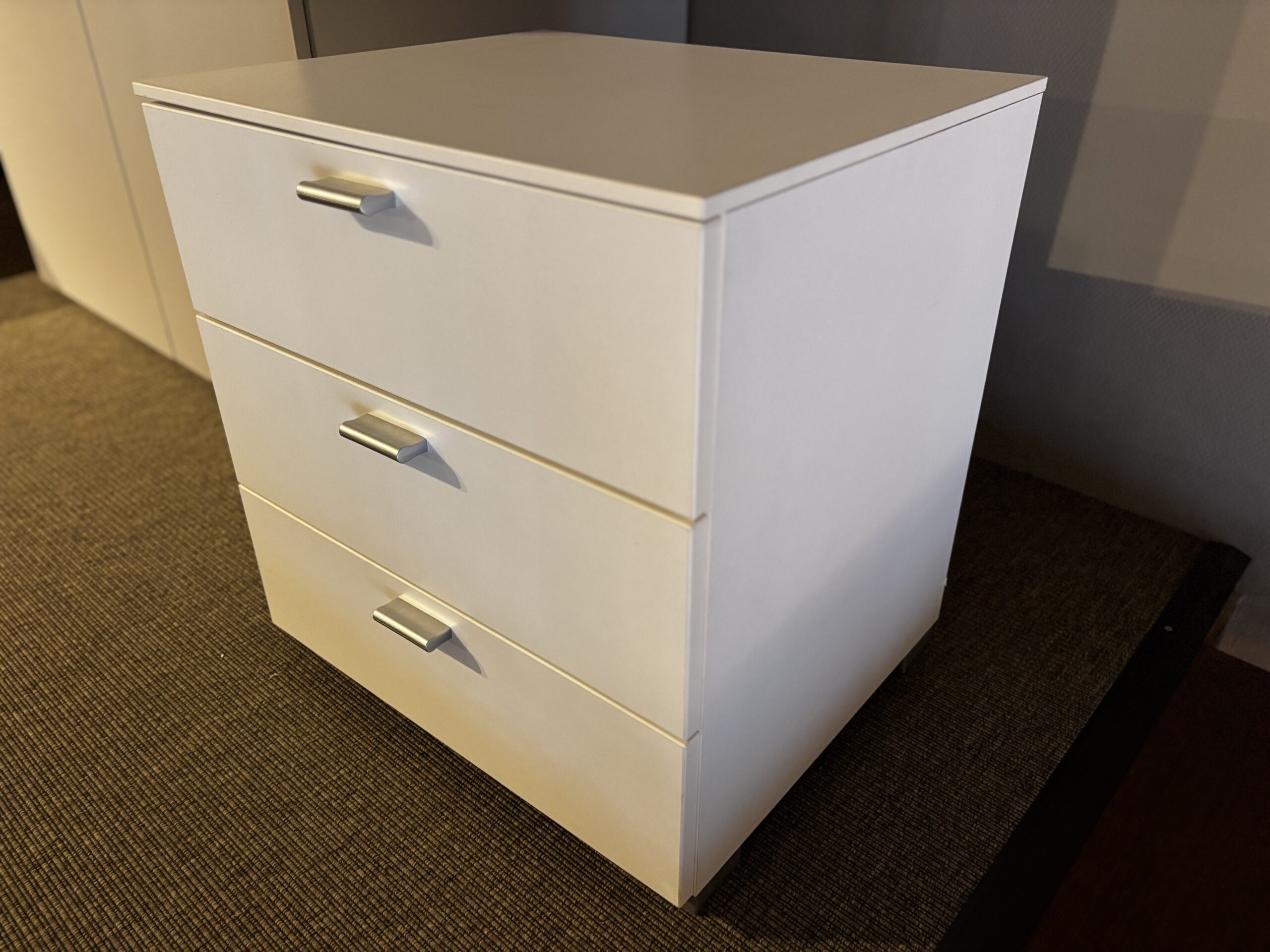 Mooi degelijk nachtkastje met 3 laden maat 50x52x42 in alpine wit. Het kastje heeft een afwerking van melamine.